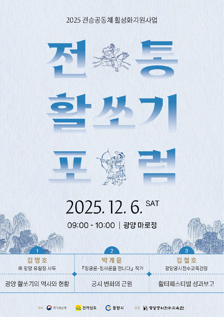 이러한 활동은 활쏘기를 단순한 체험이 아닌 지역의 중요한 전승문화로 자리매김시키는 기반이 되었으며, 이번 포럼은 그 성과를 종합적으로 공유하고 앞으로의 광양 활쏘기 전승 활성화 방향을 논의하는 의미 있는 시간이 될 전망이다.