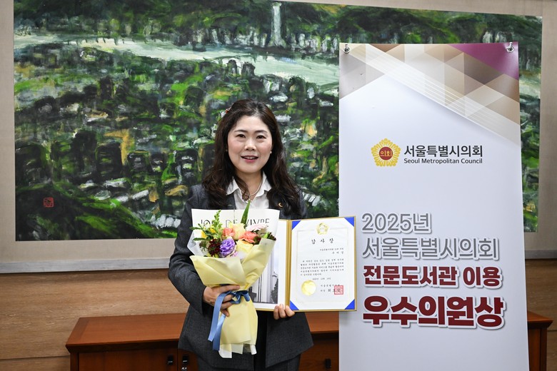 ‘의회전문도서관 이용 우수의원상’은 한 해 동안 서울시의회 전문도서관을 적극적으로 활용한 의원을 대상으로 선정·수여되는 상으로 구미경 의원은 입법 연구 및 정책 개발을 위한 자료 활용, 의정활동의 내실화에 기여한 점이 높이 평가되어 올해 수상자로 선정되었다. 구 의원은 2024년에도 같은 상을 수상한 바 있어, 2년 연속 수상의 영예를 안았다.