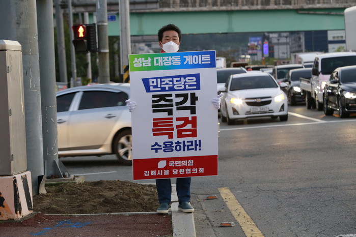 이정화 김해시의원 '성남 대장동 게이트, 민주당은 즉각 특검수용하라'피켓 1인시위