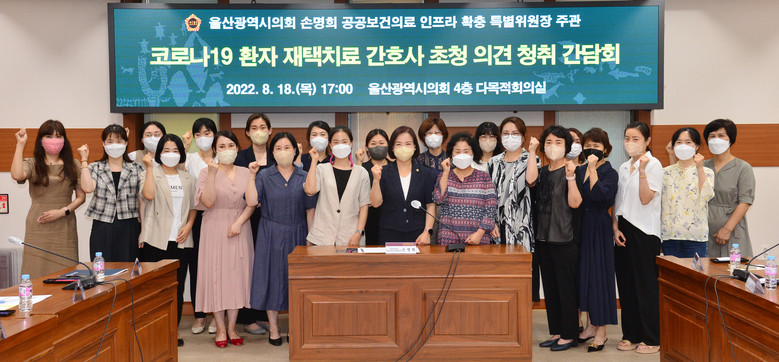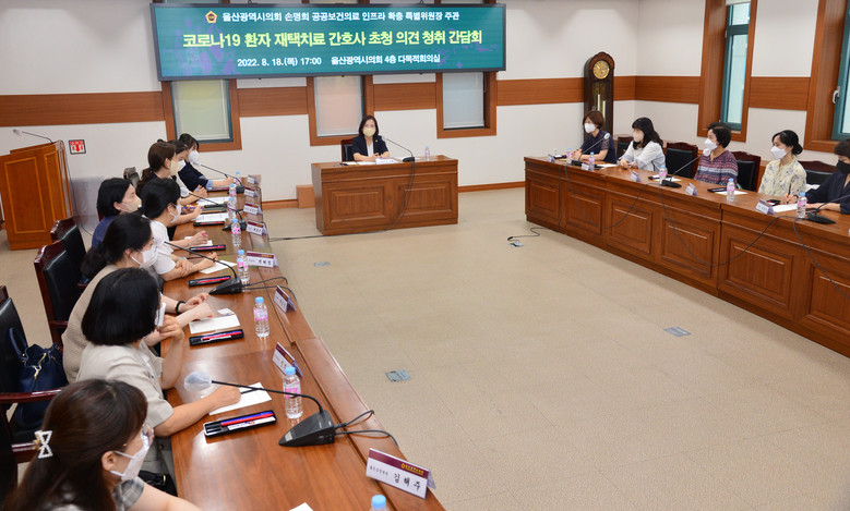 [울산 세계타임즈=이호근 기자] 울산광역시의회 손명희 공공보건의료 인프라 확충 특별위원장은 18일 오후 5시 시의회 4층 다목적회의실에서 ‘코로나19 환자 재택치료 간호사 초청 의견 청취 간담회’를 개최했다.