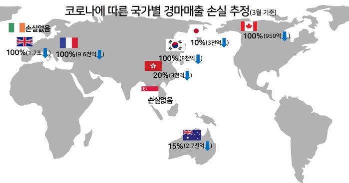 경마의 종주국인 영국도 코로나19를 피해갈 수 없다. 3월 18일부터 4월 30일까지 영국 내 모든 경주가 취소되었다. 영국경마협회는 경주 취소가 20조원 경마시장에 미칠 부정적 파급 효과를 우려하여 경주 재개에 촉각을 곤두세우고 있다. 9천명 이상의 확진자가 발생한 프랑스도 4월 중순까지 경주를 전면 취소했다. 11조 경마 매출이 반 토막 날 위기에 처했다. 아일랜드는 경마 산업에 생계를 의존하고 있는 사람들을 위해 온라인 발매 기반 무관중 경마를 이어나가고 있었지만 확진자 급증가로 결국 4월 19일까지 경주를 취소했다.