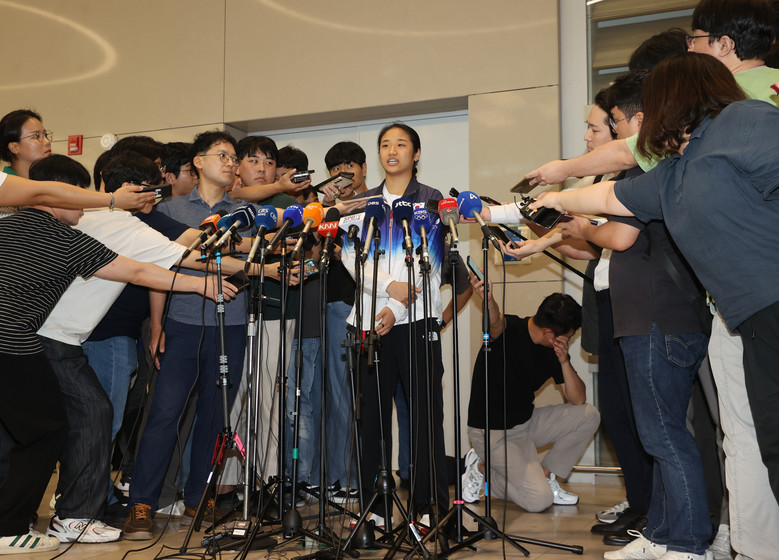 2024 파리올림픽 배드민턴 여자 단식에서 금메달을 차지한 안세영이 7일 오후 인천국제공항을 통해 귀국하며 취재진 질문에 답하고 있다