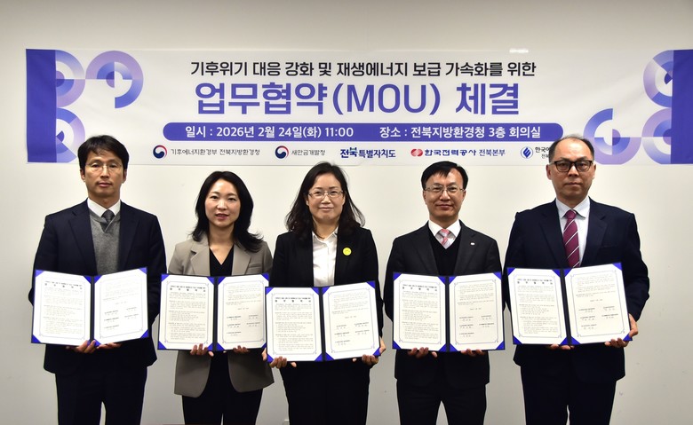 ○ 주민참여 확대와 지역 상생 기반 강화로 전북 에너지 전환 실현 [세계타임즈=전북 이상호 기자] 전북특별자치도는 24일 전북지방환경청, 새만금개발청, 한국전력공사 전북본부, 한국에너지공단 전북지역본부와 함께 전북지역 재생에너지 보급 가속화를 위한 업무협약(MOU)을 체결하고, 기후위기 대응과 에너지 대전환 실현을 위한 협력에 나섰다.
