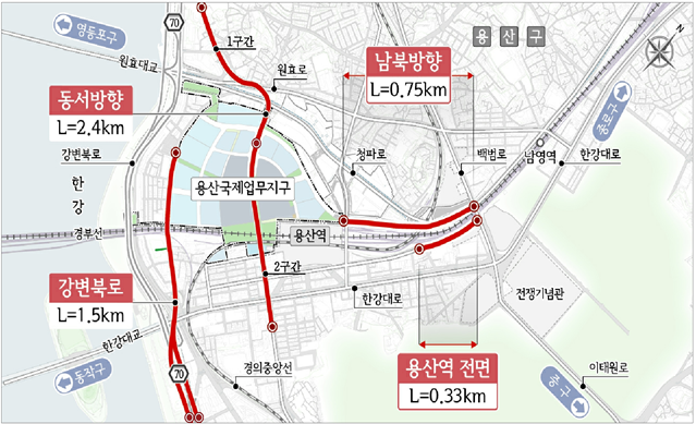 양 기관은 용산국제업무지구 ▲ 동서 방향 연결 도로(A-1) ▲ 강변북로 연결 도로(A-2) ▲ 남북 방향 연결 도로(B-1) ▲ 용산역 전면~백범로 연결 도로(B-2) 등 4개 신설 도로의 기본 및 실시설계 용역 계약을 16일 체결하고, 향후 약 24개월간 관련 작업을 진행한다.
