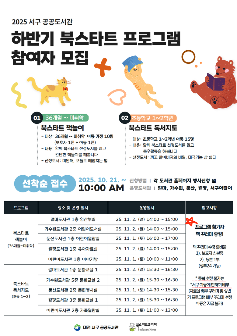 해당 프로그램은 36개월부터 취학 전 아동을 대상으로 한 책 놀이 프로그램과 초등 1~2학년을 위한 독서지도 프로그램으로 나뉘어 진행된다. 도서관마다 11월 1일부터 2일까지 이틀간 1회씩 운영될 예정이다.