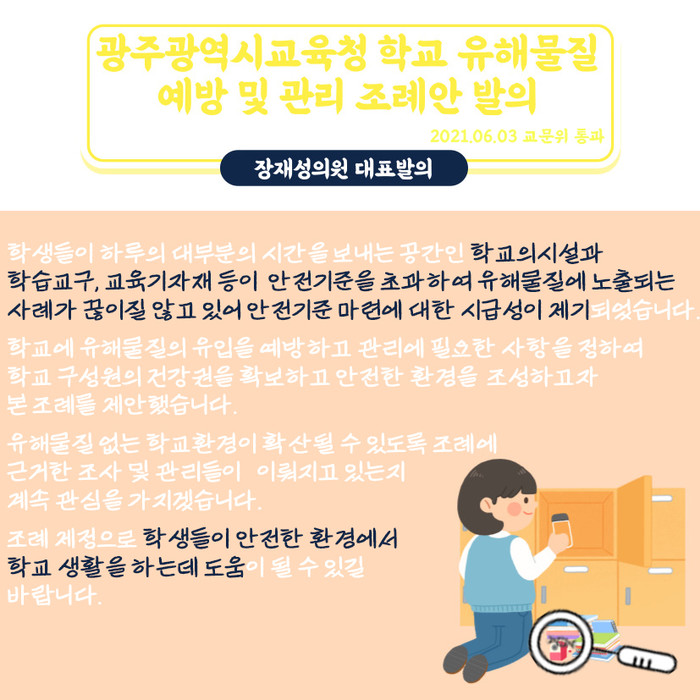이어 장 의원은 “유해물질 없는 학교환경이 확산될 수 있도록 조례에 근거한 조사 및 관리들이 이뤄지고 있는지 계속 관심을 가지겠다”며, “조례 제정으로 학생들이 안전한 환경에서 학교생활을 하는데 도움이 될 수 있길 바란다“고 말했다.