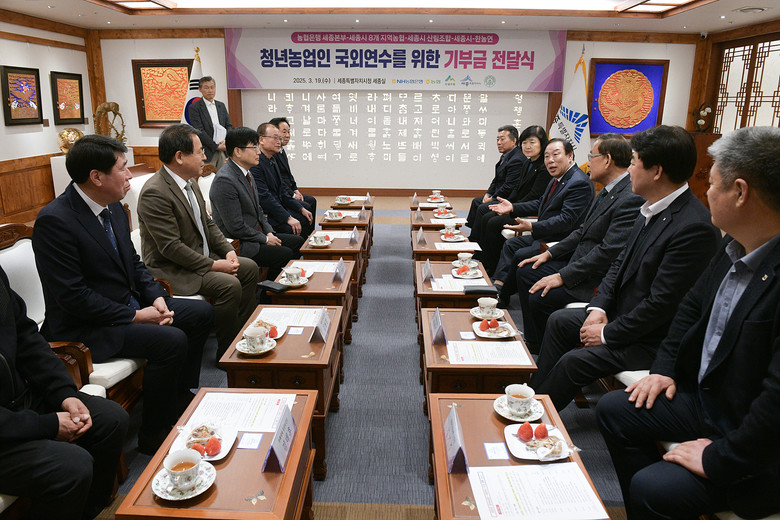 세종특별자치시(시장 최민호)는 19일 시청 5층 세종실에서 청년농업인 국외연수 지원을 위한 기부금 전달식을 개최했다.