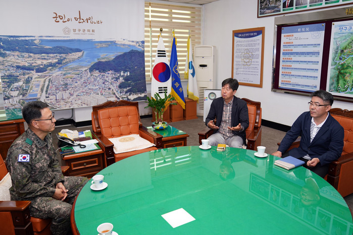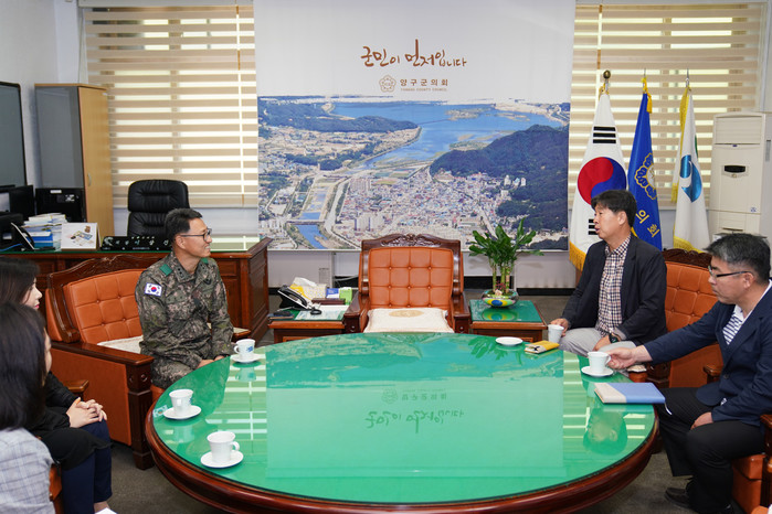 [양구군=세계타임즈 김민석 기자] 이상건 양구군의회의장이 28일 의장실에서 장광선 2사단장을 접견해 당면사항을 협의했다.
