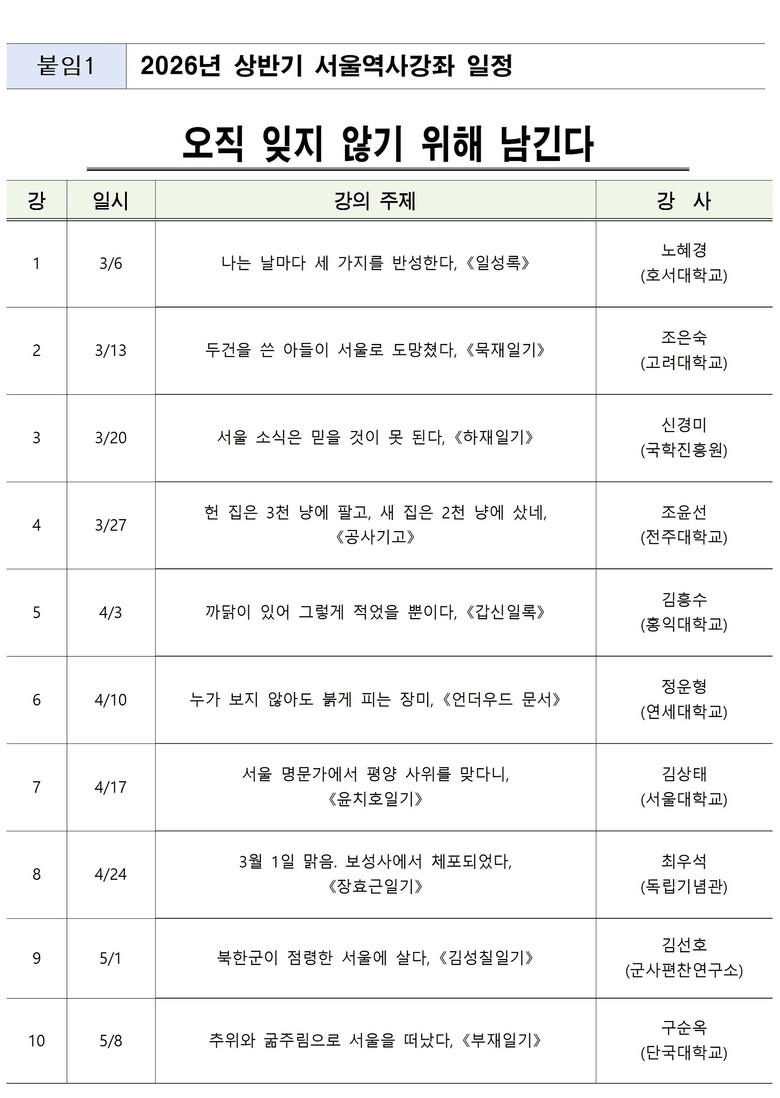 이상배 서울역사편찬원장은 “이번 강좌를 통해 개인의 기록이 역사적 흐름 속에서 살아 있는 증언으로 마주하는 계기가 되시길 바란다”며 “앞으로도 보다 다양한 주제로 서울의 역사를 알리기 위한 ‘서울역사강좌’를 이어나가겠다.”고 말했다.