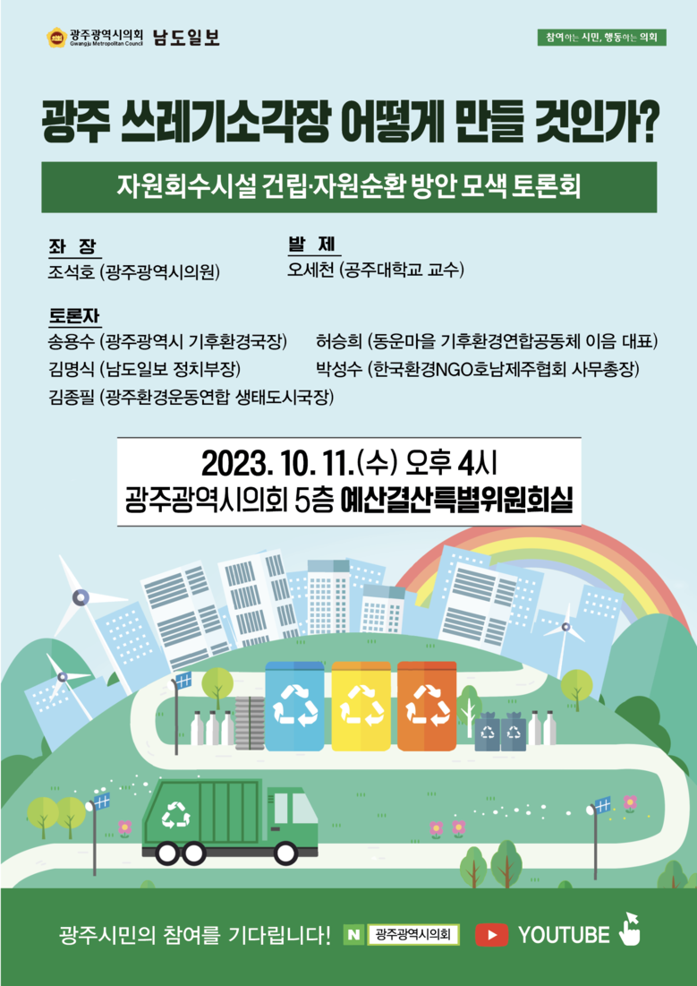 남도일보와 광주광역시의회가 11일 오후 4시 시의회 5층 예산결산특별위원회 회의실에서 포화상태에 다다른 지역 쓰레기 매립장의 대안책으로 떠오른 신규 쓰레기소각장의 효과적인 건립에 대해 논의하는 정책토론회를 개최한다고 10일 밝혔다.