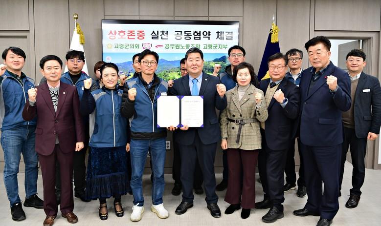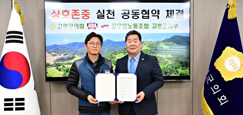 [고령군 세계타임즈=한성국 기자] 고령군의회(의장 김명국)는 1. 12.(목) 11시 공무원노동조합(지부장 류동열)과 상호존중 실천 공동협약 체결식을 가졌다.