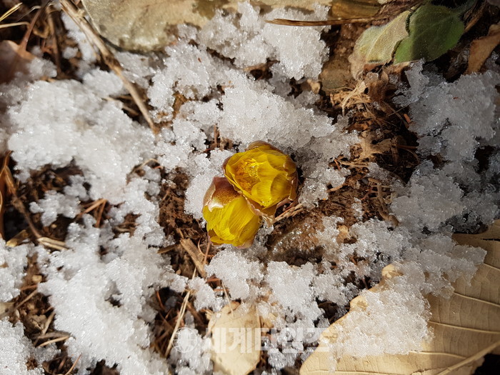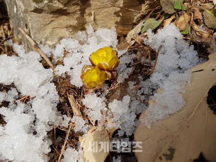 [증평군=세계타임즈 이현진 기자] 19일 눈이 녹아서 비가 된다는 ‘우수’를 맞아 증평읍 율리 좌구산휴양림에 봄의 전령 복수초가 노란 꽃망울을 활짝 피워 등산객과 휴양랜드 숙박객의 눈길을 끌고 있다.