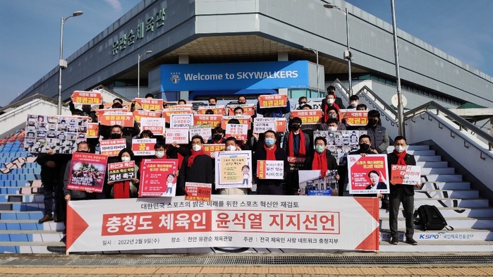 전국 체육인 사랑 네트워크는 9일 오전 11시 충남 천안 유관순체육관에서 충청도 지부 회원 1000여 명이 윤석열 지지선언 기자회견을 진행했다고 밝혔다.