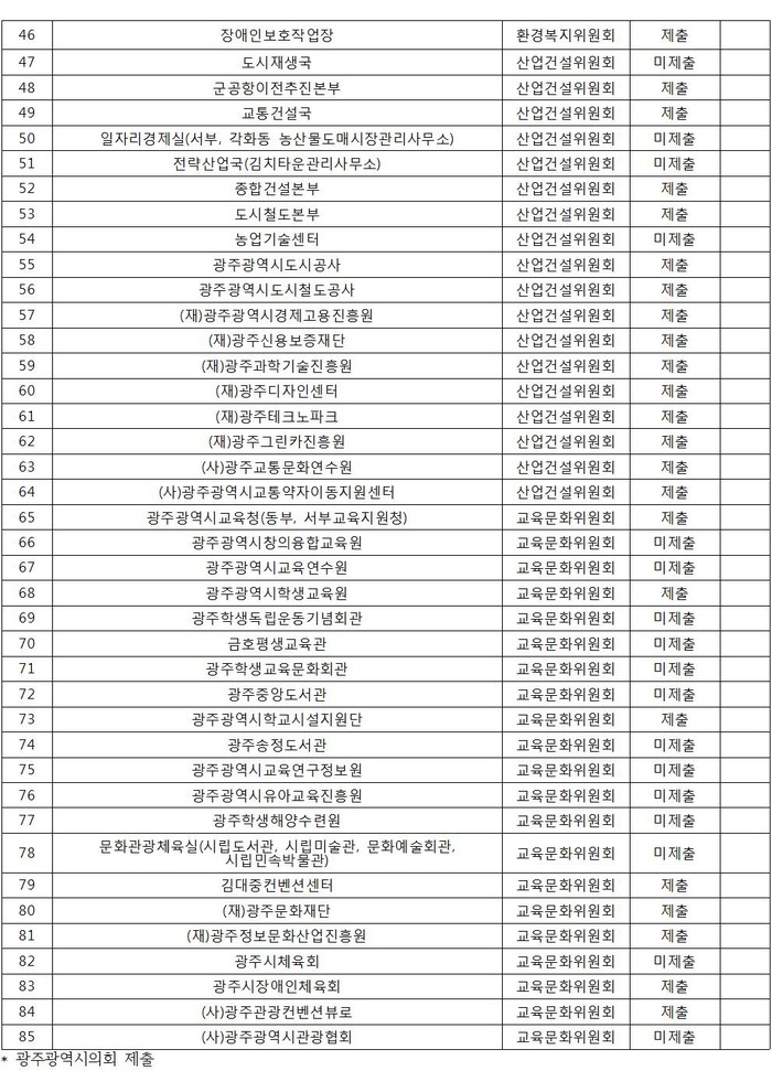 4개 상임위별로 기한 내 미제출된 내역을 살펴보면 ▲행정자치위원회 17개 기관 중 9곳 미제출 ▲환경복지위원회 29개 기관 중 19곳 미제출 ▲산업건설위원회 18개 기관 중 4곳 미제출 ▲교육문화위원회 21개 기관 중 13곳이 기한 내 미제출 하였다. 기한을 넘겨서 감사자료를 제출한 45개 기관 중 자료가 늦은 것에 대해 어떠한 사유도 밝히지 않았다.[참고 1]
