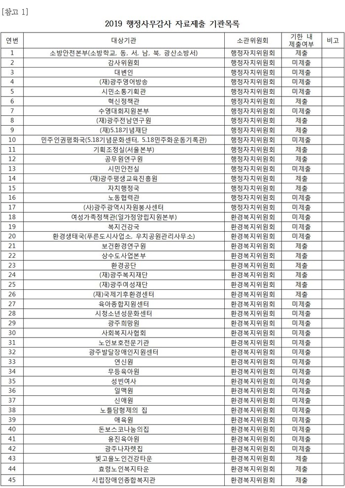 2019년도 광주광역시의회 행정사무감사 종합 계획에 따르면 운영위원회를 비롯한 5개 위원회에 감사서류 제출기한은 10월 11일로 되어 있다.