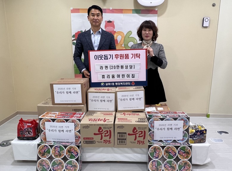 갈마1동 행정복지센터는 14일 휴리움어린이집으로부터 ‘우리가 함께라면’ 나눔 실천 행사를 통해 마련한 라면(20만 원 상당)을 기탁받았다.