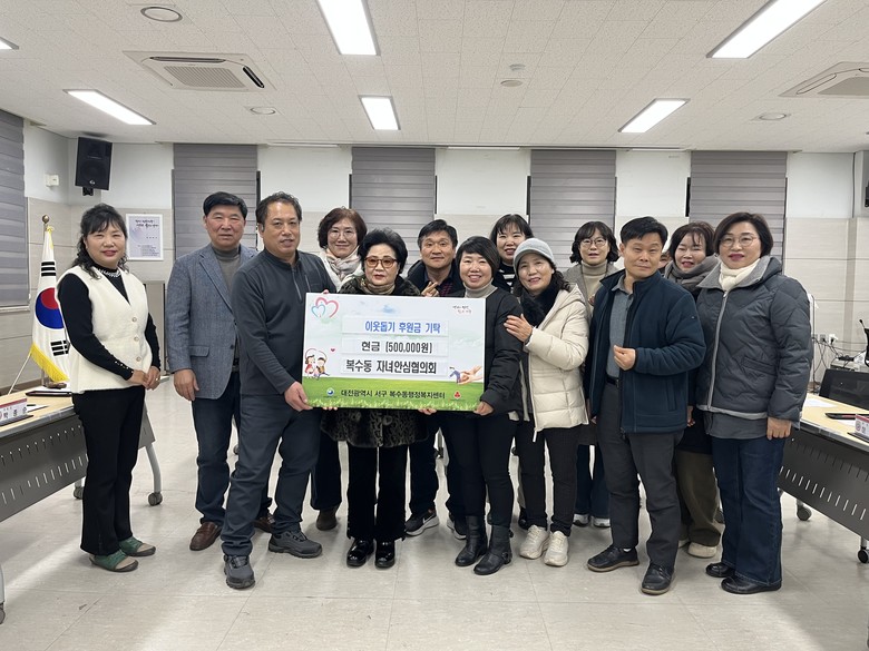 같은 날, 복수동 행정복지센터는 동 자녀안심협의회가 관내 청소년 취약계층을 돕기 위한 후원금 50만 원을 기탁했다고 전했다.