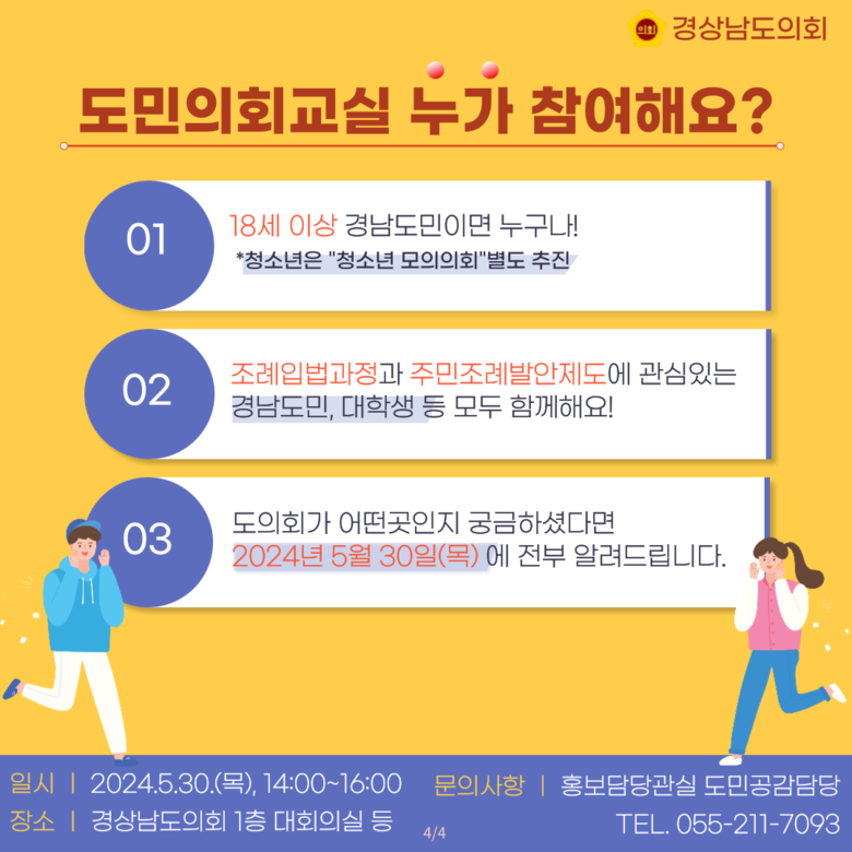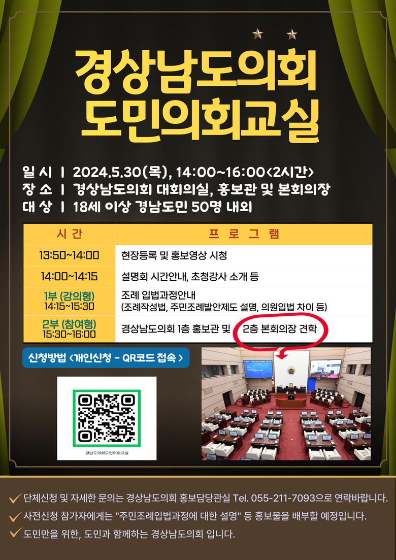 [경남 세계타임즈=최성룡 기자] 경상남도의회(의장 김진부)는 도민의 지방자치 참여강화를 위해 2024년 5월 30일(오후 2시) “도민의회교실”을 개최한다.