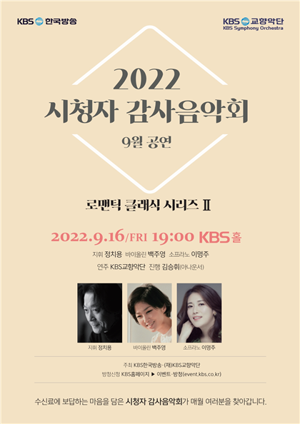 KBS교향악단은 지난 7월 열린 ‘로맨틱 클래식 시리즈’에 이어 오는 9월 16일 ‘로맨틱 클래식 시리즈Ⅱ’를 부제로 시청자 감사음악회의 9월 공연을 연다. 이번 연주회에서는 한예종 음악원 지휘과 교수인 정치용의 지휘와 바이올리니스트 백주영과 소프라노 이명주가 협연자로 나선다.