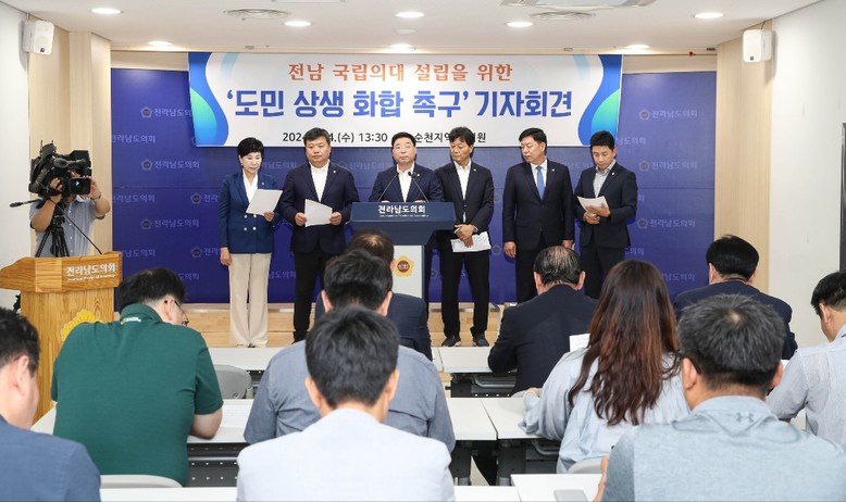 [순천시 세계타임즈=우덕현 기자] 전라남도의회 순천지역 도의원들은 9월 4일 도의회 브리핑룸에서 전남 국립의대설립을 위한 ‘도민 상생 화합 촉구’ 성명서를 발표했다.
