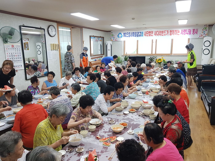 신이원 관장은“오늘 법1동 어르신들을 위해서 으뜸새마을금고와 사랑의 사다리 밴드에서 삼계탕과 닭죽을 지원해주셔서 큰힘이 된다.”면서 감사함을 전했다.
