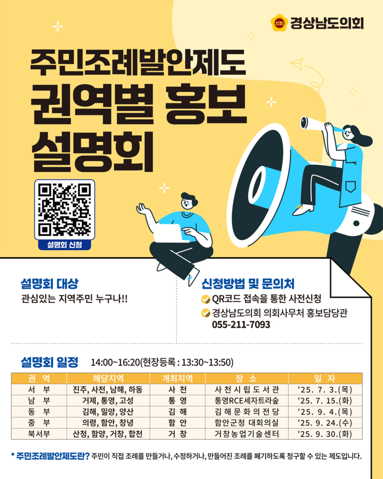 [경남 세계타임즈=최성룡 기자] 경상남도의회(의장 최학범)는 오늘(7월 3일) 사천시립도서관 대강당에서 주민조례발안제도 권역별 홍보설명회를 개최했다. 이는 주민이 직접 조례를 제안하는 주민조례발안제도에 대한 도민들의 이해도를 높이고 직접 참여를 확대하기 위해 도민들을 직접 ‘찾아가는’ 특강형 설명회로 추진하게 되었다.