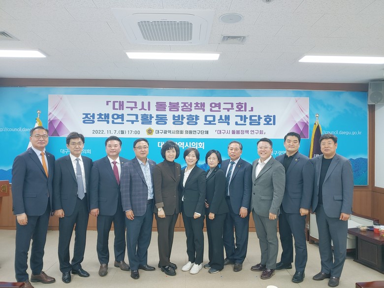 이날 간담회는 대구시 돌봄정책 연구회가 구성되고 처음 이루어진 자리로, 연구단체의 연구활동방향을 모색하고 특히 2022년도 연구방향 및 2022년 의원 정책연구용역 발주를 앞두고 더욱 깊이 있는 연구활동을 펼쳐 나가고자 마련되었다.