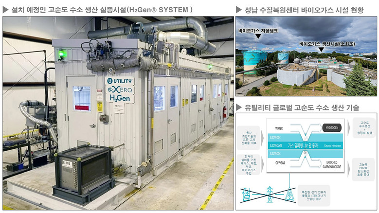 해당 시설은 성남수질복원센터에서 하수를 미생물로 분해할 때 발생하는 바이오가스(메탄+이산화탄소 혼합물) 중에서 활용되지 못하고 소각되는 504N㎥(노멀 세제곱미터) 분량의 바이오가스를 유틸리티 글로벌의 독자 기술로 순도 99% 이상의 수소로 전환한다.