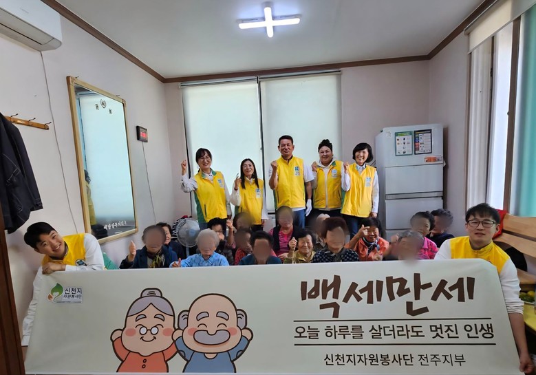 [전북 세계타임즈 = 이영임 기자] 신천지자원봉사단 전주지부(지부장 곽종렬·이하 전주지부)는 24일 전주시 덕진구 팔복동 용암경로당에서 어르신들의 정서적 안정과 소통을 위한 ‘백세만세’ 봉사활동을 진행했다. 이날 회원 15명이 참여해 어르신들과 함께 따뜻한 교류의 시간을 가졌다.