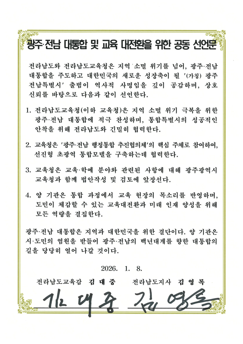 전남교육청은 4개 항으로 된 선언문에서 지역 소멸 위기 극복을 위한 광주·전남 대통합에 적극 찬성하며, 통합 특별시의 성공적인 안착을 위해 전남도와 긴밀히 협력하기로 했다. 이어, ‘광주·전남 행정통합 추진협의체’에 핵심 주체로 참여하여, 선진형 초광역 통합모델을 구축하는 데 협력하기로 했다.
