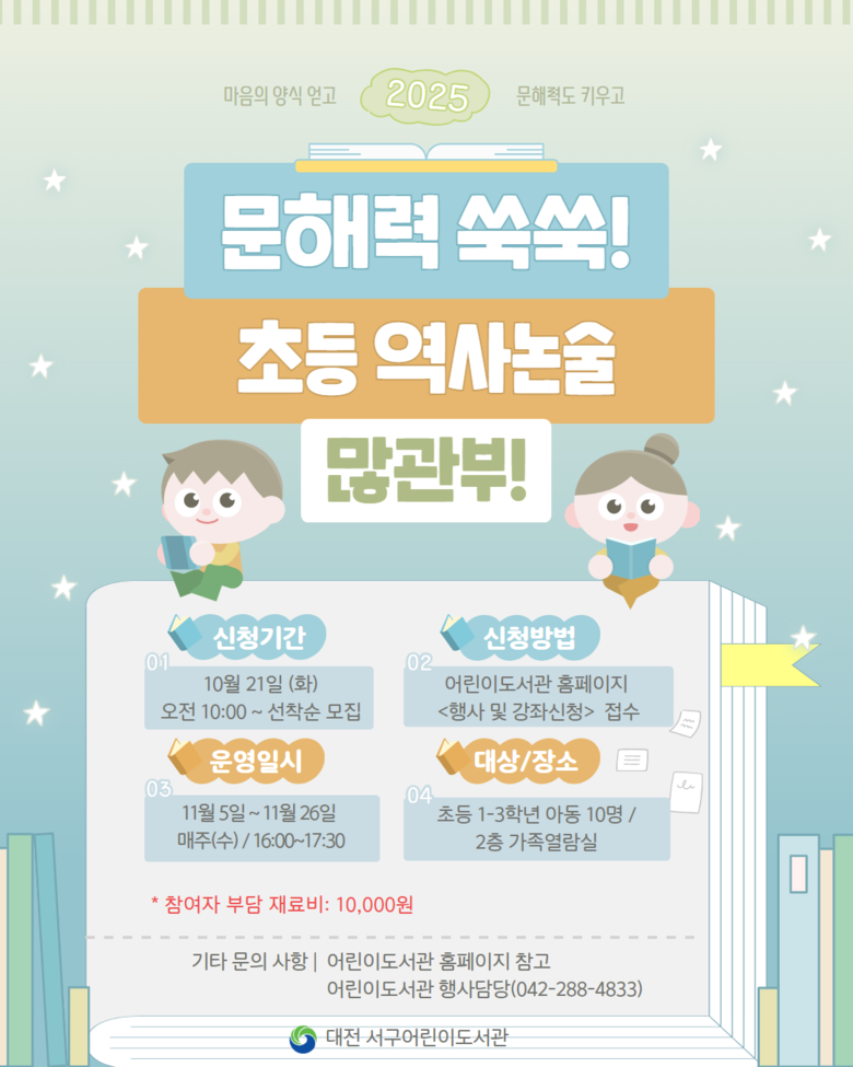 참가를 원하는 이는 10월 21일 화요일 오전 10시부터 어린이도서관 홈페이지 내 행사 및 강좌 신청란을 통해 선착순 신청하면 된다. 기타 자세한 사항은 홈페이지를 참고하거나 전화(☎042-288-4833)로 문의하면 된다.