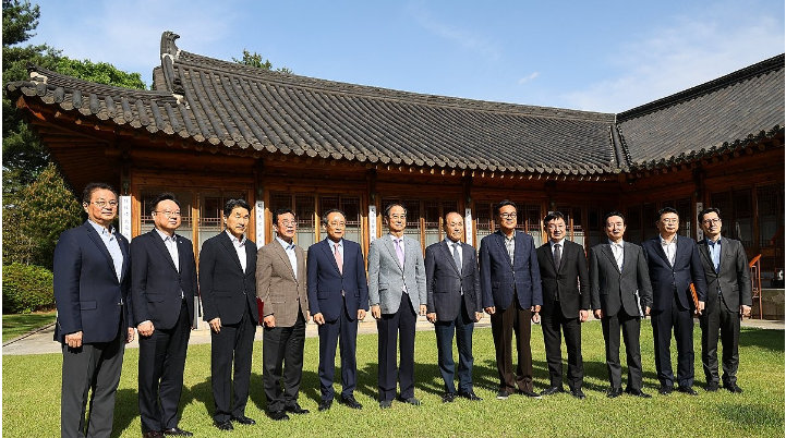 삼청동 총리 공관에서 열린 긴급 고위 당·정·대 협의회에서 한덕수 국무총리, 황우여 국민의힘 비상대책위원장, 추경호 원내대표, 정진석 대통령실 비서실장을 비롯한 참석자들이 기념촬영을 하고 있다.