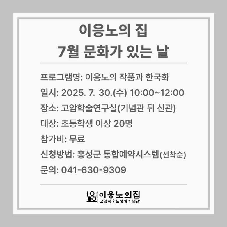 한편, 이응노의 집은 매월 ‘문화가 있는 날’에 맞춰 지역사회와 연계한 예술 프로그램을 기획·운영하고 있으며, 예술교육과 작가 아카이브 확산을 위한 활동도 꾸준히 이어가고 있다. 자세한 내용과 참가 신청은 홍성군 통합예약시스템을 통해 가능하며, 기타 문의는 041-630-9309로 하면 된다.