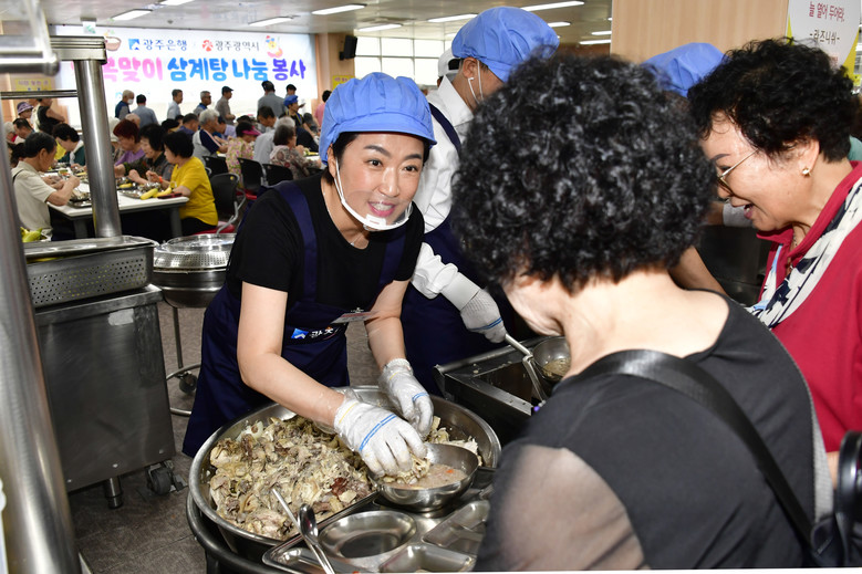 이날 행사에는 신수정 의장을 비롯한 시의원 9명과 고병일 광주은행장을 포함한 임직원들이 참여해 어르신들에게 삼계탕을 정성껏 배식하고, 부채 등 나눔 물품을 전달하며 안부를 살폈다.