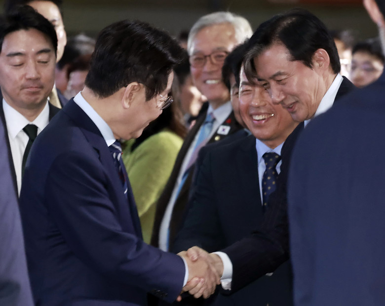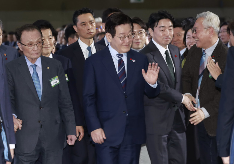 이재명 대통령이 2일 경기 고양시 킨텍스에서 열린 제22기 민주평화통일자문회의 출범회의에 이해찬 수석부의장(왼쪽)과 입장하고 있다. 2025.12.2 [대통령실통신사진기자단]