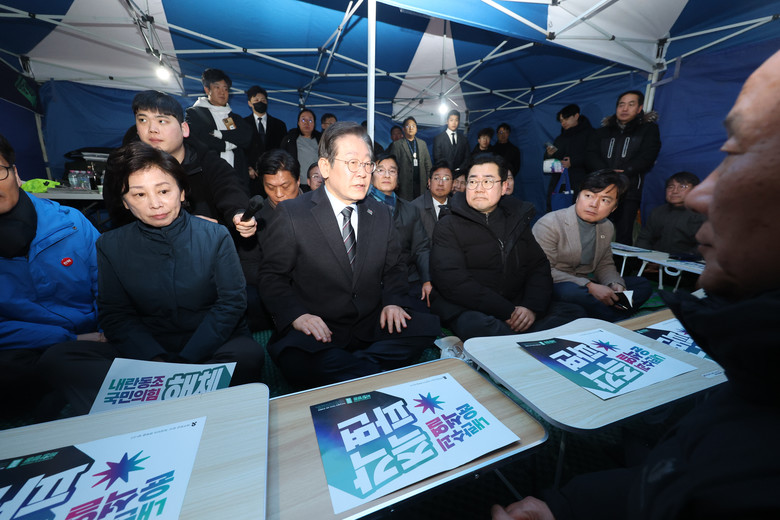 더불어민주당 이재명 대표가 9일 서울 경복궁역 인근에서 단식 농성 중인 ‘윤석열 즉각 퇴진·사회대개혁 비상행동 대표단’을 찾아 대화하고 있다. 2025.3.9 [공동취재]