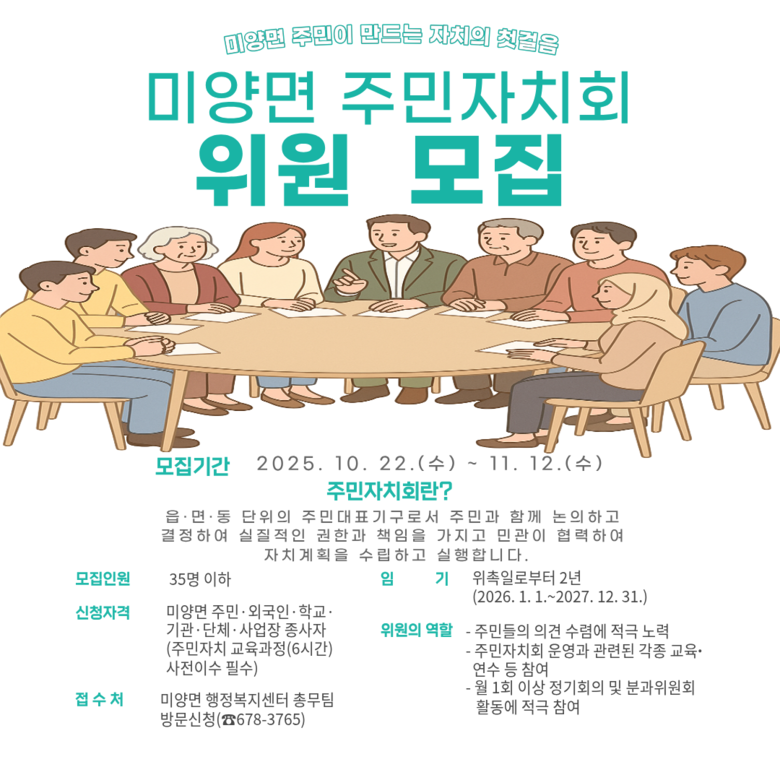 이번 주민자치회는 기존 주민자치위원회에서 한 단계 발전한 주민 중심의 자치기구로, 주민이 직접 지역의 문제를 논의하고 해결방안을 모색하는 데 핵심적인 역할을 하게 된다. 모집 인원은 35명 이하이며, 미양면 주민, 학교·기관·단체·사업장 종사자라면 누구나 신청할 수 있다.