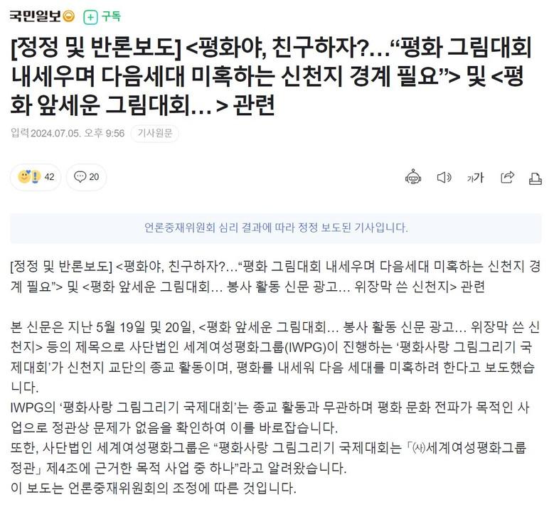 IWPG는 “국민일보는 정정과 반론 보도문이 실린 것에 대해 깊은 고민과 행동을 수반해야 할 것”이라며 “더 이상 불공정하고 편파적인 보도가 없도록 해달라”고 요구했다.