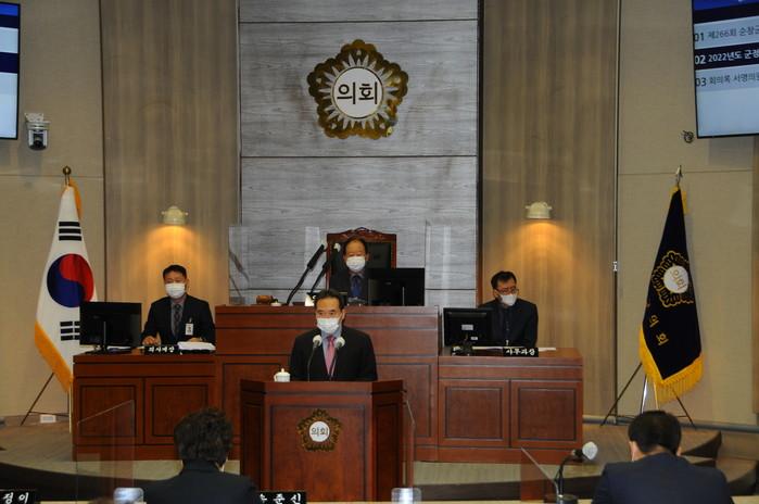 신용균 의장은 20일 개회사를 통해 지난해 코로나19 대유행의 위기를 슬기롭게 헤쳐 온 군민들에게 감사 인사를 전하며, 어렵고 힘든 상황에서 국지도 55호선 강천산진입로 4차로 확장사업과 섬진강 제방정비사업의 국가예산 확보, 예산 5천억 달성의 성과에 대해 순창군수와 공직자들의 노고에 감사의 뜻을 전했다.