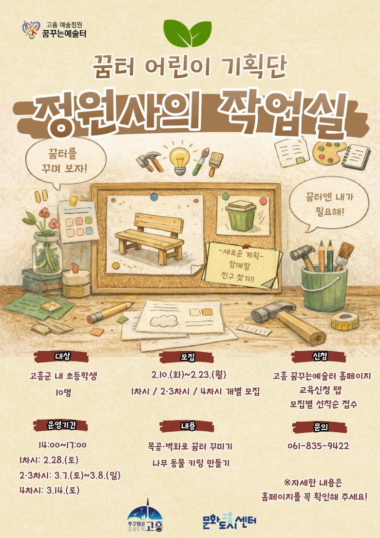 [고흥군 세계타임즈=우덕현 기자] 고흥군(군수 공영민)은 오는 2월 10일부터 23일까지 꿈터 어린이 기획단 「정원사의 작업실」에 참여할 지역 내 초등학생 10명을 선착순으로 모집한다고 밝혔다.