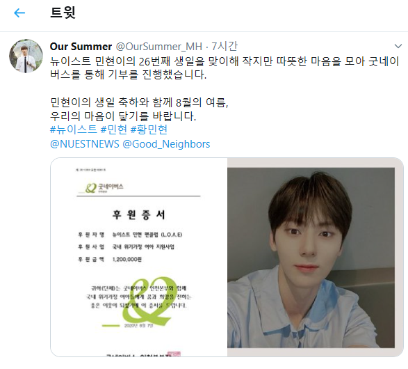 민현 팬클럽 ‘L.O.Λ.E(러브)’는 “가수 ‘민현’의 생일을 맞아 의미 있는 기부를 하고 싶었는데 굿네이버스 ‘소녀야 너는 반짝이는 별’캠페인을 통해 지나온 청소년기를 떠올리게 됐다”며, “불편하고 힘든 상황에 처했을 위기가정 여아들을 응원하는 마음으로 기부했다”고 말했다.