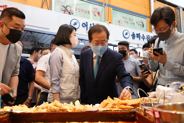 [세계타임즈 이채봉 기자]국민의힘 홍준표 예비후보가 19일 오후 서울 송파구 소재 새마을시장을 찾았다. 홍 후보의 이날 일정에는 지역 국회의원인 배현진 국민의힘 최고위원이 함께했다.