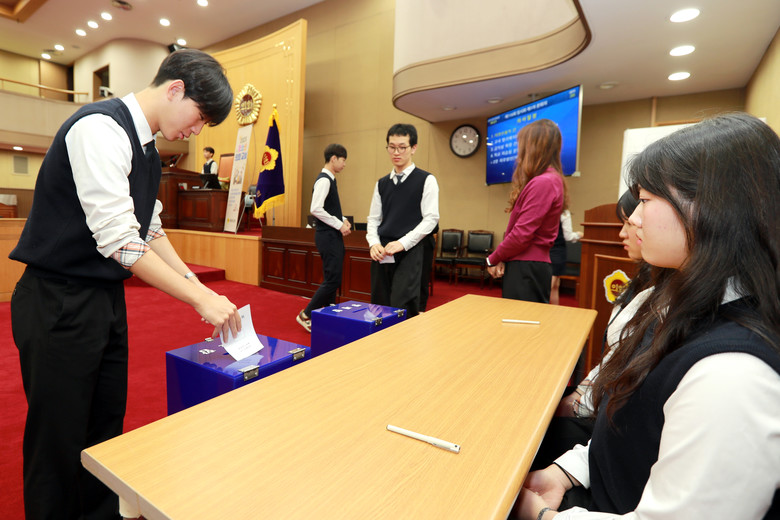 의회교실에 참여한 옥천고 학생들은 무기명 투표를 통해 의장을 선출하고 ‘교내 엘리베이터 이용제 도입 조례안’, ‘급식실 확장 건의안’, ‘학교 자습실 운영 건의안’ 등 3건의 안건을 상정해 찬반 토론과 전자투표를 진행했다.