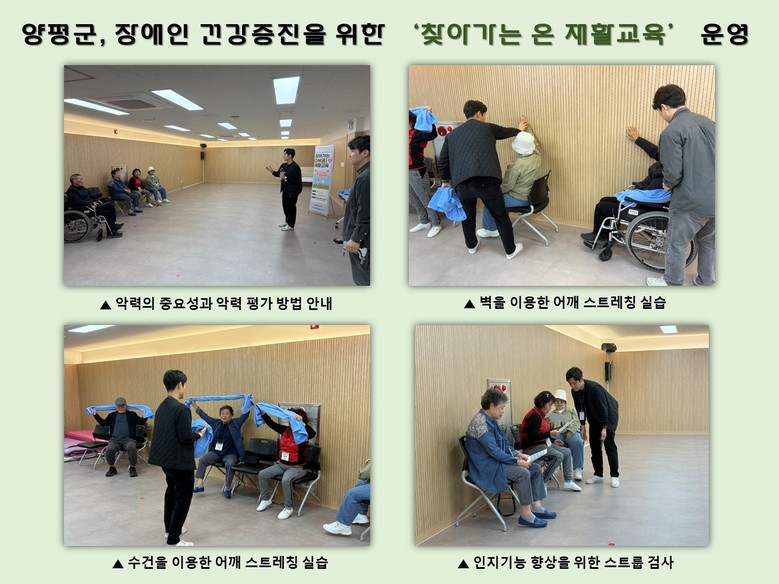 배명석 보건소장은 “이번 교육은 상체 근력과 인지 기능 향상에 실질적인 도움이 되는 프로그램으로, 지역 장애인의 자가 건강관리 역량 강화에 크게 기여할 것으로 기대한다”며 “앞으로도 주민들이 체감할 수 있는 다양한 재활 및 건강증진 프로그램을 지속적으로 추진하겠다”고 밝혔다.