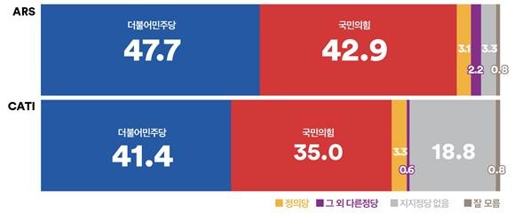 ARS :민주 41.4% vs 국힘 35.0% 지지정당 없음 18.8%
