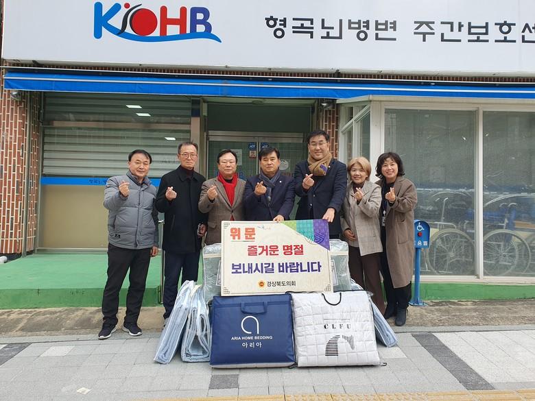 [경북 세계타임즈=한성국 기자] 경상북도의회 김용현.황두영· 허복 도의원(구미)은 1월 18일(수) 계묘년 설 명절을 앞두고 경상북도의회를 대표해 구미시에 소재한 형곡뇌병변주간보호센터와 사랑터어린이집을 차례로 방문해 위문품을 전달하고 장애인들을 보살피고 있는 관계자들을 격려하며 시설운영의 애로사항을 청취했다.