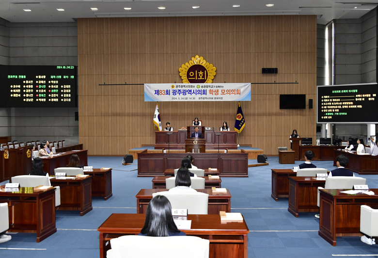 [광주 세계타임즈=손권일 기자] 광주광역시의회(의장 정무창)는 5월 24일(금) 오후 2시 30분 시의회 본회의장에서 송광중학교 학생들을 대상으로 ‘제83회 광주광역시의회 학생 모의의회’를 개최했다.