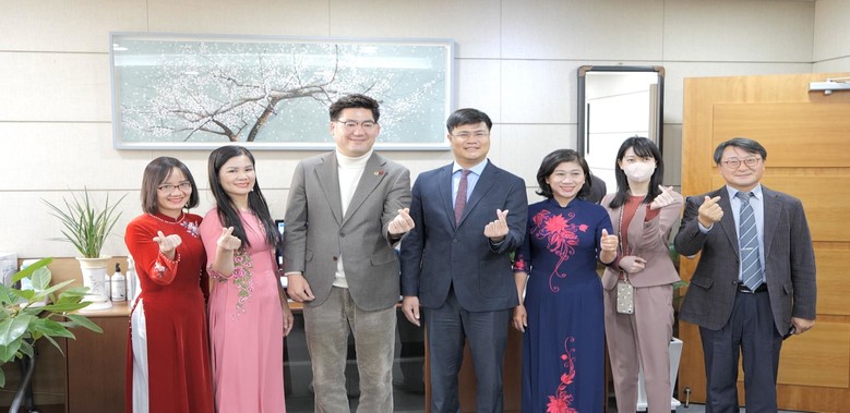 왼쪽부터 베트남 응에안성 응우옌 티 흐엉(Nguyen Thi Huong) 인민위원회 사회부 부장, 응우옌 티 타잉 흐엉(Nguyen Thi Thanh Huong) 문화체육부 부국장, 팜반투안(Pham Van Toan) 외무부 부국장, 심철의 부의장, 당 티 타잉 후옌(Dang Thi Thanh Huyen) 외무국 실무자로 상호 기념품을 전달했다.