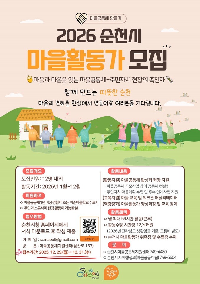 이번에 모집하는 마을활동가는 마을활동가 양성과정 따순마을학교 수료자 또는 마을공동체 경험 1년 이상의 순천시 거주 시민을 대상으로 하며, 서류 및 면접 심사를 거쳐 최종 선발된다. 선발된 마을활동가는 2026년 1월부터 12월까지 순천시 관내에서 활동하게 된다.