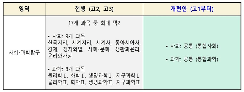 가장 큰 변화는 사회·과학 선택과목 17개가 없어지고 ‘통합사회’ ‘통합과학’ 등 2개 과목 체계로 바뀐다. 기존에는 사회 또는 과학과목에만 응시할 수도 있었지만, 2028년부터는 통합사회, 통합과학 등 2개를 모두 치러야 한다.